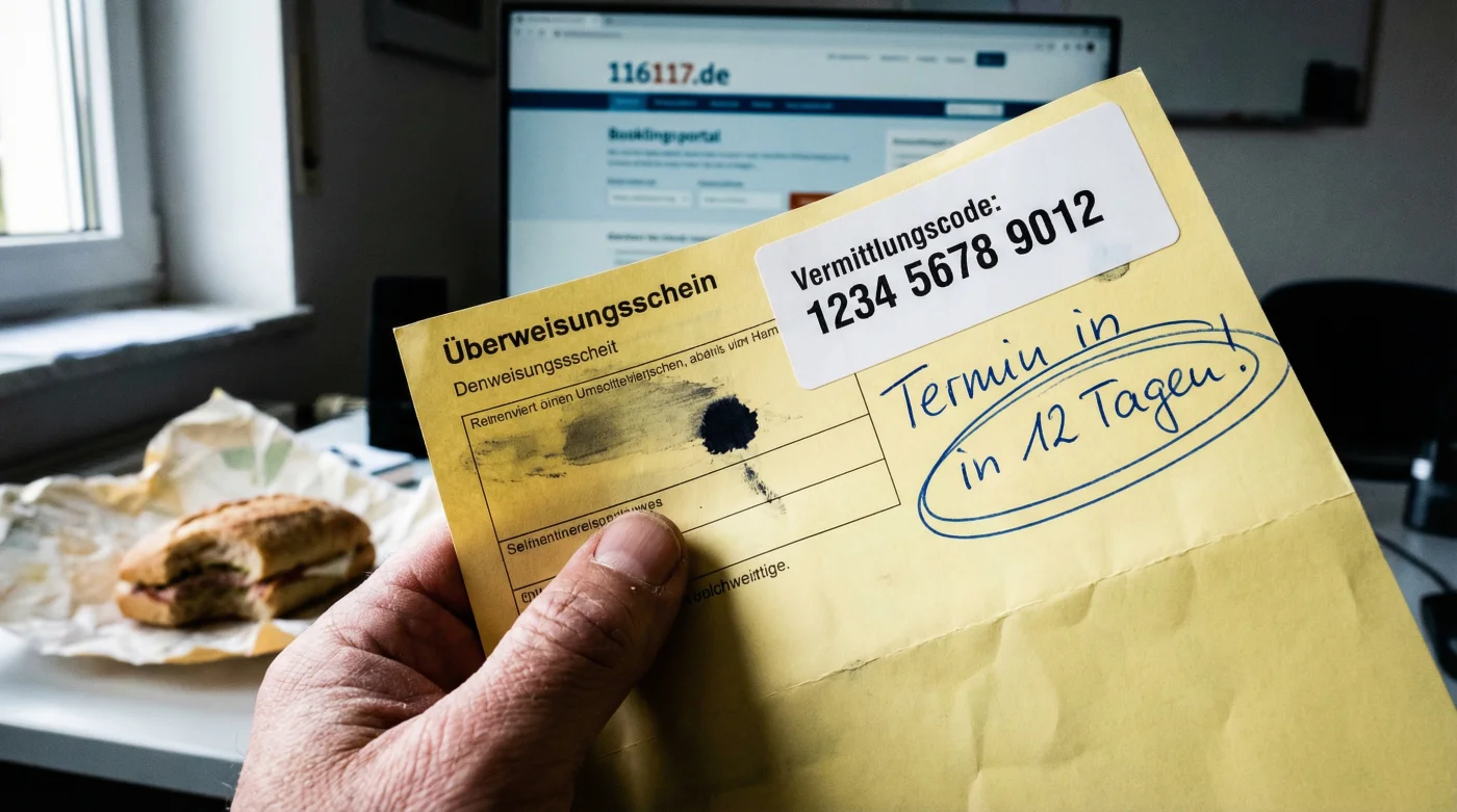 - Schritt 3: Die Überweisung mit Code: Bei festgestellter Dringlichkeit erhalten Sie eine spezifische Überweisung, auf der ein 12-stelliger alphanumerischer Vermittlungscode gut sichtbar aufgedruckt ist.
