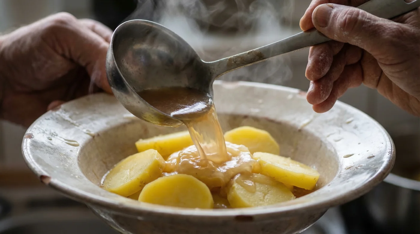 Das Fundament eines echten, klassischen Kartoffelsalats ruht auf einer simplen, aber genialen Technik: Kochend heiße Rinderbrühe muss zwingend über die noch sehr warmen, frisch gepellten Kartoffelscheiben gegossen werden. Dieser Thermoschock ist das Herzstück der Zubereitung. Wenn die heiße Flüssigkeit (ideal sind mindestens 95 Grad Celsius) auf die angeschnittene Oberfläche trifft, platzen die äußeren Stärkemoleküle auf. Dieser Vorgang, die sogenannte Gelatinisierung, bewirkt, dass die Rinderbrühe nicht nur aufgesaugt wird, sondern sich mit der freigesetzten Kartoffelstärke zu einer viskosen, unvergleichlich sämigen Soße verbindet. Diese natürliche Bindung macht jegliche künstliche Emulgatoren oder schwere Eiprodukte völlig überflüssig.