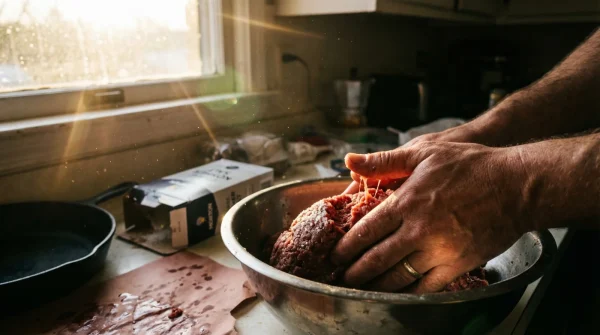 - Rindfleisch Patties trocknen durch das würzende Einmischen von Salz massiv aus